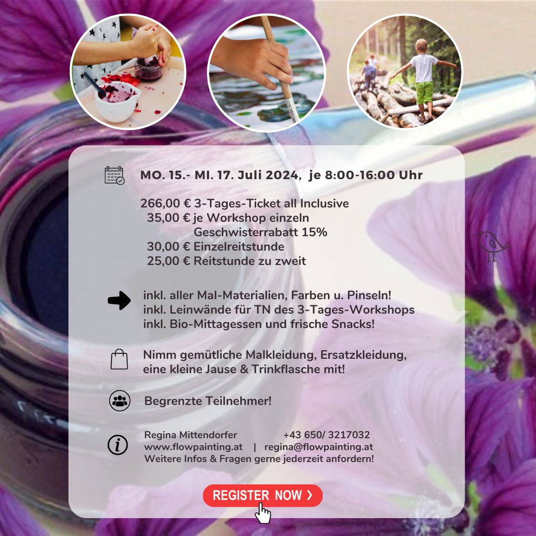 Das bevorstehende Event im Mühlviertel verspricht ein buntes und lehrreiches Programm für Kinder ab 5 Jahren. Am Erlebnishof Oberweiringer in Pregarten können die Kinder ihre eigenen Farbtinten aus Blüten herstellen, was nicht nur lehrreich, sondern auch eine wunderbare Möglichkeit ist, die Natur zu erkunden. Verschiedene Experimente mit Wasser und Farbe regen die Sinne an und fördern die Vorstellungskraft. Den Umgang mit Pferden und das Reiten zu lernen, bieten eine einzigartige Gelegenheit, Verantwortungsbewusstsein und den Respekt vor Tieren zu entwickeln. Die Outdoor Gruppenspiele sind nicht nur unterhaltsam, sondern auch förderlich für den Teamgeist und die Naturverbundenheit der Kinder. Erlebnisse in der Natur ermutigen die Kinder, die Umwelt zu schätzen und zu schützen. Dieses dreitägige Event verspricht, ein unvergessliches Erlebnis zu werden und bietet eine hervorragende Gelegenheit, um in die Welt der Kunst einzutauchen und gleichzeitig die Freude an der Natur zu wecken.
