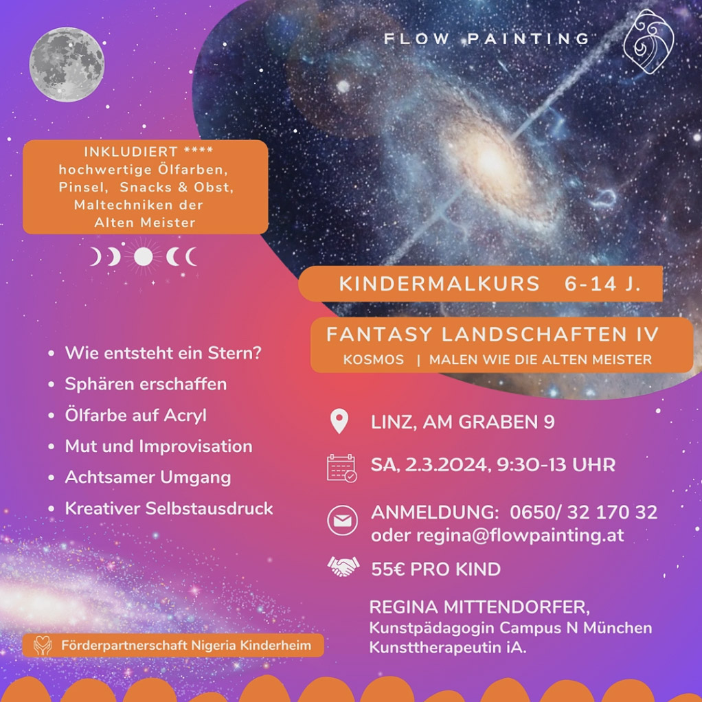 Der Workshop dauert von 9:30 Uhr bis 13 Uhr. In der Pause gibt es ein leckeres Kinderbuffet mit Getränken, Obst und Frühstückshörnchen. Im Preis inbegriffen sind hochwertige Farben, Pinsel, Malunterlagen und anderes Malzubehör. Mitzubringen ist nur eine Leinwand im mittleren Kleinformat (quadratisch oder Querformat, ca. 40x50 oder 50x50 cm). Es kann auch jedenfalls eine Leinwand vor Ort gekauft werden. Dieser Kurs ist eine tolle Gelegenheit, die Faszination des Kosmos kreativ zu entdecken.